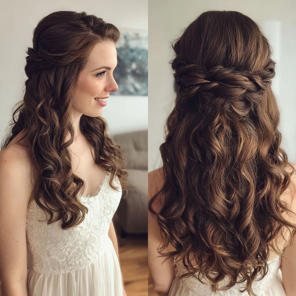 This hairstyle combines the best of both worlds: soft curls and a lifted crown. The half-up portion keeps your hair styled while the curls add romance. It’s a versatile look that pairs well with almost any dress. You’ll feel elegant but still playful.