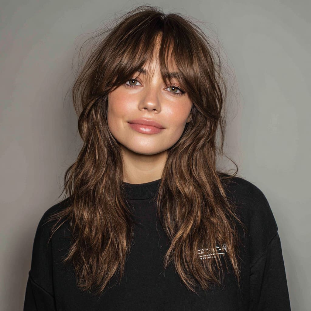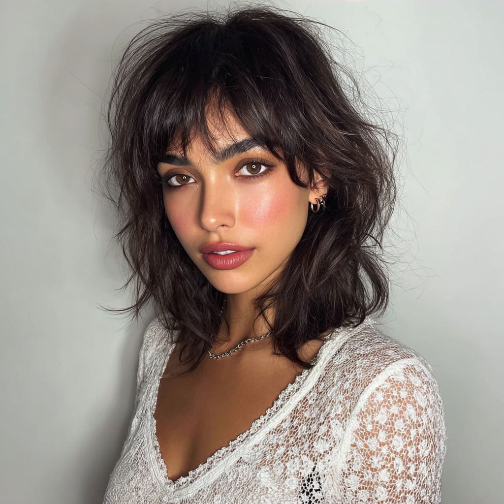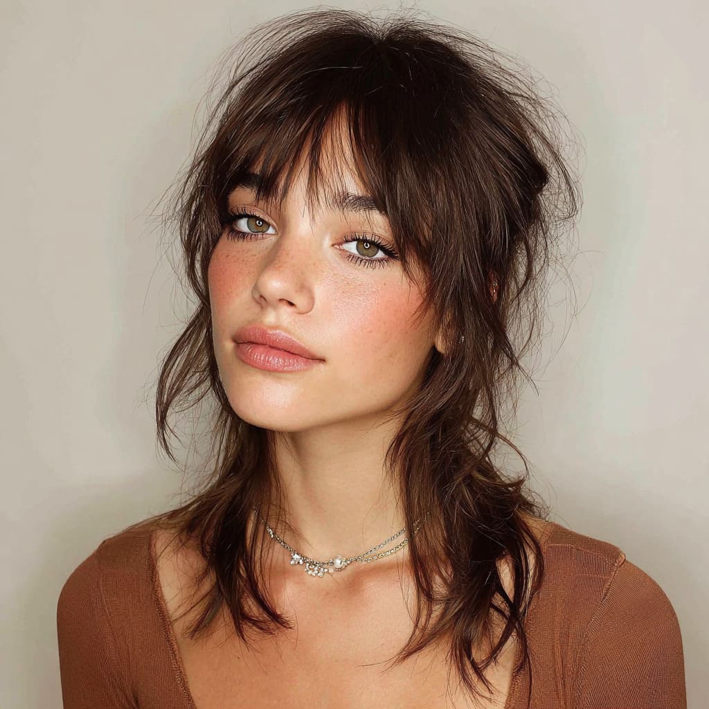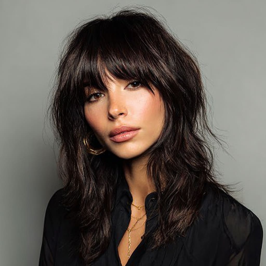 If you’re looking for something a bit bolder, this choppy shag with blunt bangs is the way to go. The blunt bangs hit right at the eyebrows, giving the style a modern, edgy vibe. The choppy layers create lots of movement, and this cut is perfect if you want a hairstyle that really makes a statement without much effort.