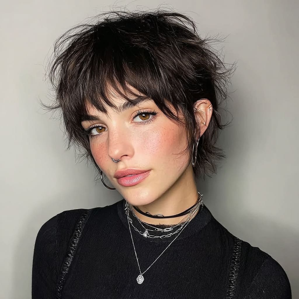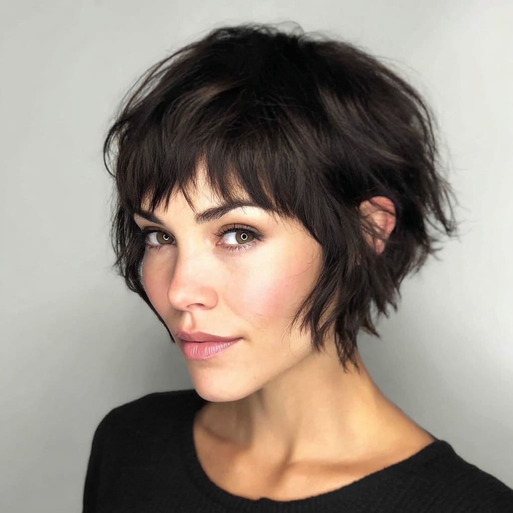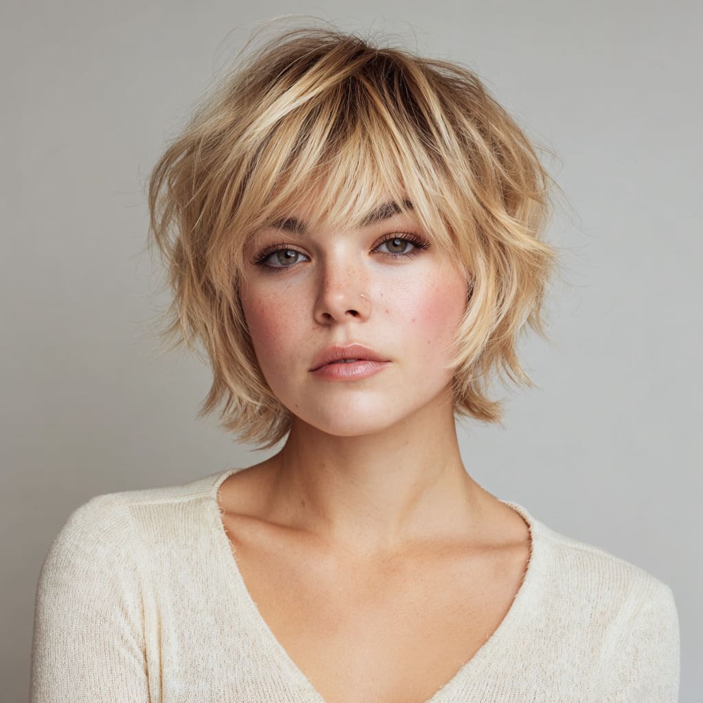 This style is everything you want in a short shag: texture, volume, and an effortlessly cool vibe. The wispy bangs are light and playful, and they really open up the face. It’s a relaxed yet stylish look that’s perfect for any casual occasion. Plus, it’s super easy to maintain.