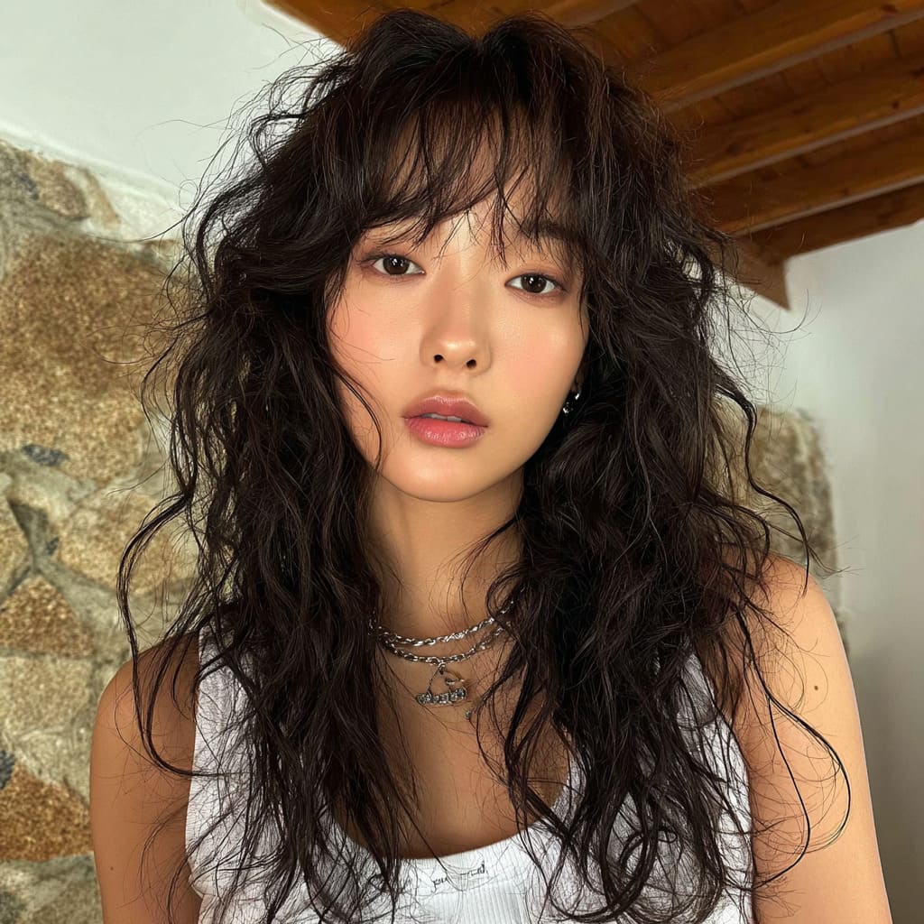 For curly-haired girls, the shag with bangs is a game-changer. The layers really enhance the natural curl, giving it bounce and volume. The bangs give you that K-pop look with a soft, youthful vibe. This hairstyle lets your natural texture shine, and it’s so easy to style.