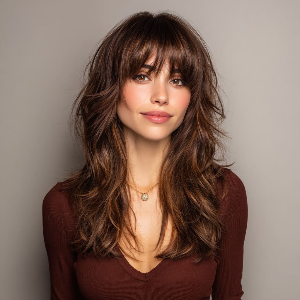 13. Layered Shag with Soft, Feathered Bangs
