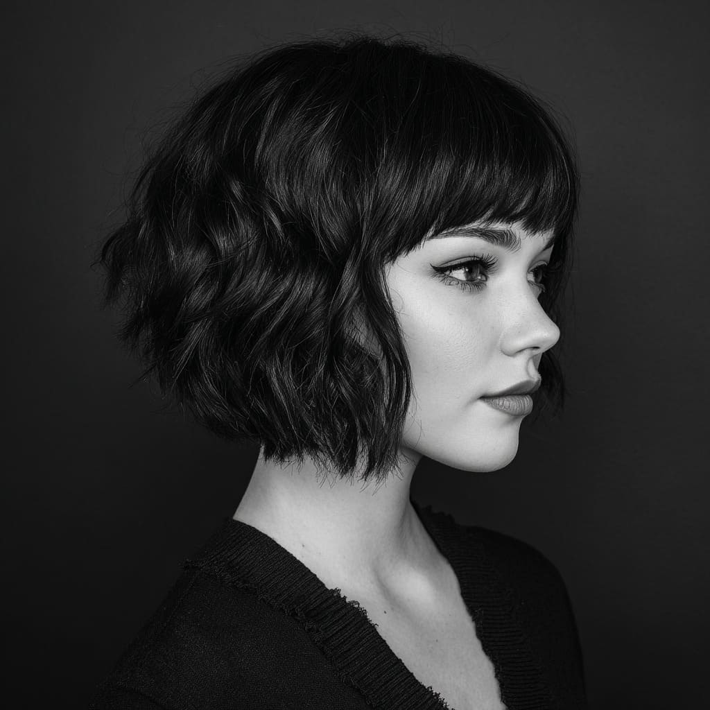For those who want a short and edgy style, a shaggy bob with blunt bangs is a sleek and modern choice. The blunt bangs create a dramatic effect, while the shaggy layers keep it fresh and textured. This is a bold style that works especially well with straight hair or loose curls.