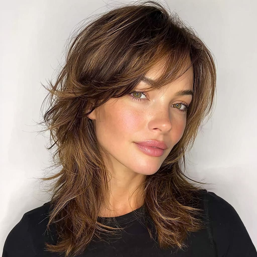 This style combines texture with a side part and side-swept bangs for a flattering, feminine vibe. The layers in the shag cut give your hair tons of volume, while the side-swept bangs frame your face softly and subtly. It’s perfect for anyone who wants a chic yet laid-back look without too much effort.