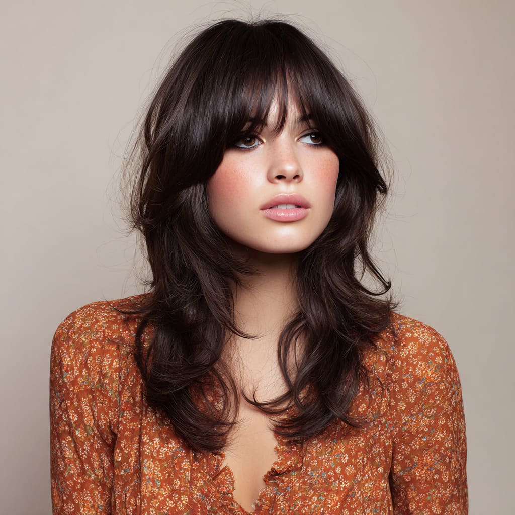 Channel your inner 70s vibe with this retro shag haircut paired with long, shaggy bangs. The long bangs add drama and framing around the face, while the shag cut gives your hair texture and volume. This style looks great on medium to long hair and gives off that boho, vintage feeling.