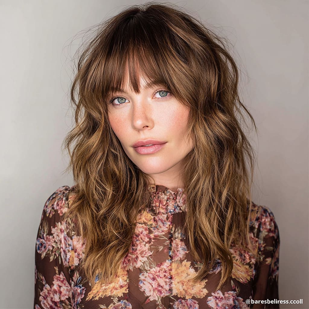 A soft wavy shag with bangs is all about that carefree, beachy look. The waves are gentle, and the bangs are soft and wispy, which gives you an effortless, cool vibe. This style works great for medium to thick hair, and it’s perfect for when you want a hairstyle that’s easy to style but still gives you that “I woke up like this” look.