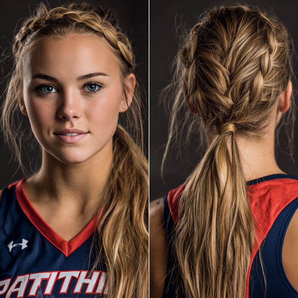 Use a small braid as a “headband” across the top of your head, then pull the rest into a low ponytail. This keeps your hair controlled while giving you a stylish, feminine twist. It’s functional, comfortable, and adds a bit of personality to your uniform. Perfect for picture day or a championship game!