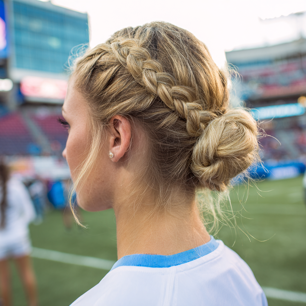 Start with a Dutch braid down the back of your head and finish it off in a bun. This keeps everything secure and adds texture to your look. It’s especially great if you have thicker hair that needs extra taming. Plus, it looks really cute both on and off the field.
