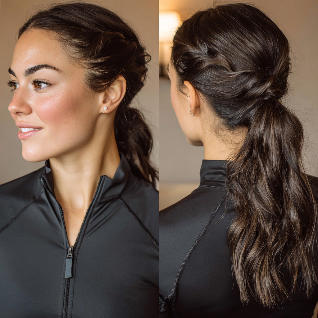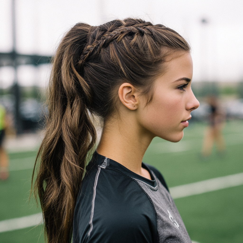 Start with a sleek ponytail, then braid the length for extra security. This hairstyle prevents tangling and keeps your hair neatly contained throughout the game. The braid adds a sporty twist to a simple look, making it feel more dynamic. It’s perfect if you want function with a hint of creativity.