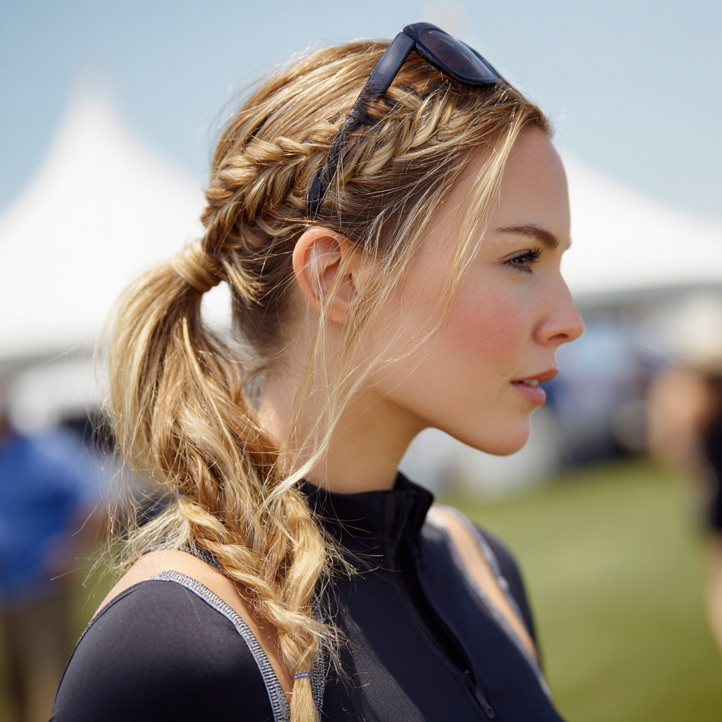 Add some detail to your ponytail by incorporating a side braid into it. This creates a layered, stylish look while maintaining practicality. The high pony keeps your hair off your neck, while the braid makes it unique and fun. It’s perfect for adding flair to your game-day style.