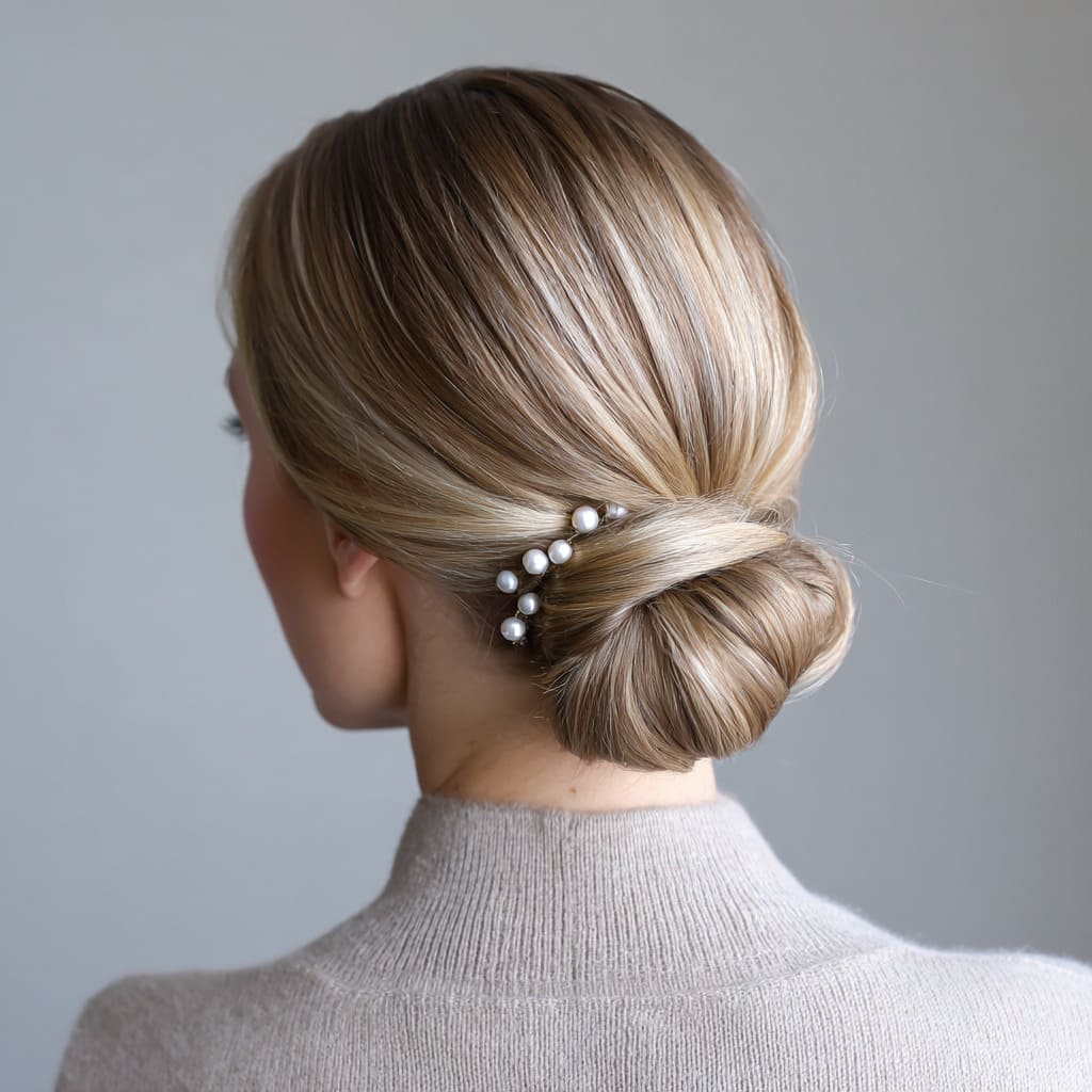 An ash blonde low bun is chic and timeless. It’s sleek, easy to do, and works for both casual outings and formal dinners. Add pearl pins for a subtle wintery detail.