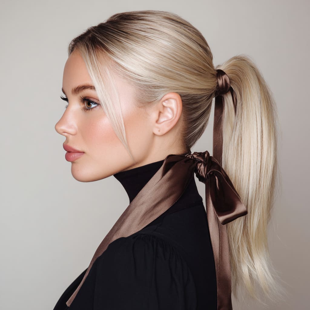 Ash blonde looks effortlessly elegant when styled into a sleek ponytail. It’s polished, trendy, and pairs perfectly with bold winter makeup. Add a satin ribbon around the base for a festive touch.
