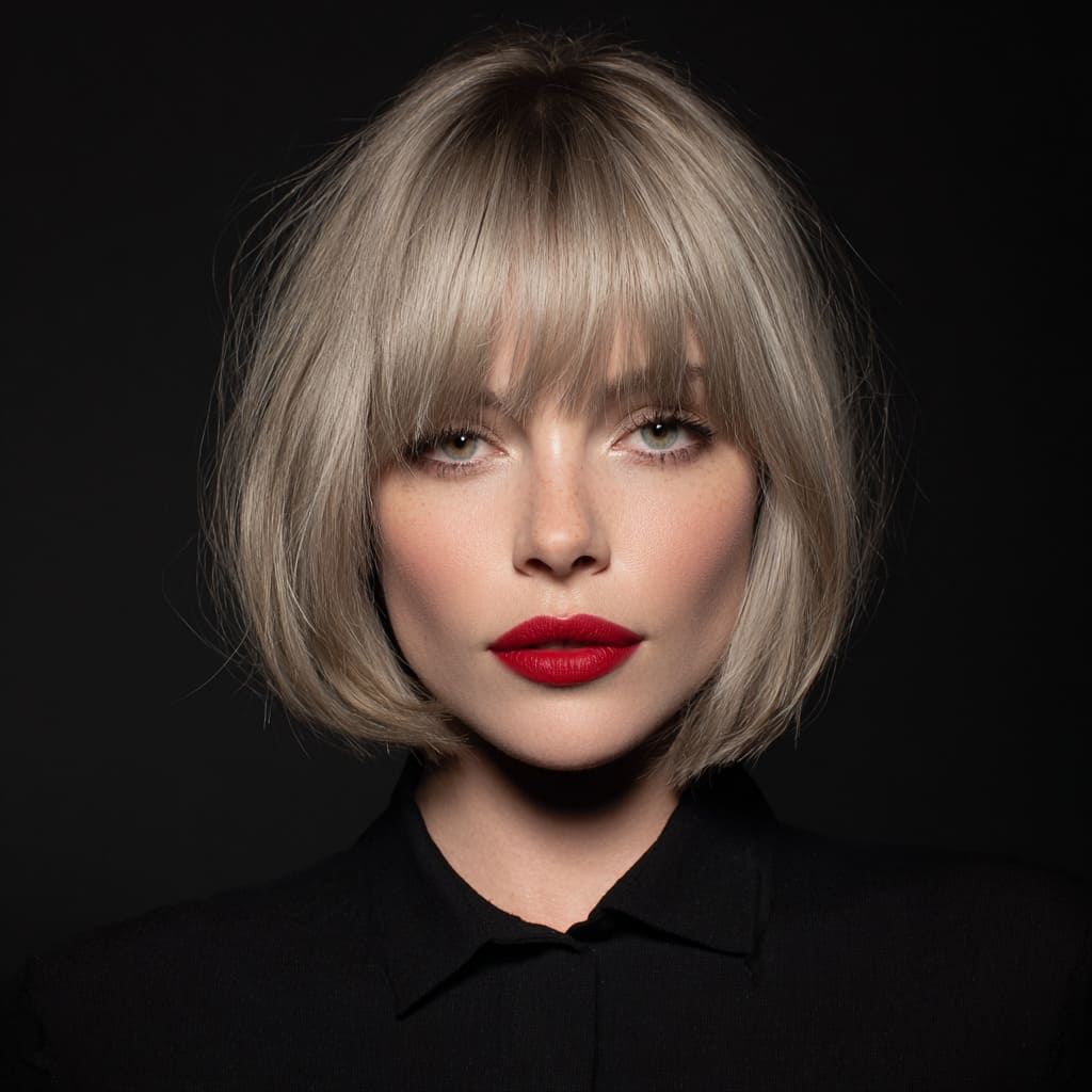 An ashy blonde bob with bangs feels chic and French-inspired. It frames your face while the muted blonde keeps things cool and stylish. Pair it with a red lip for a timeless winter look.