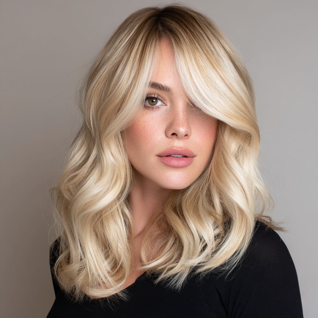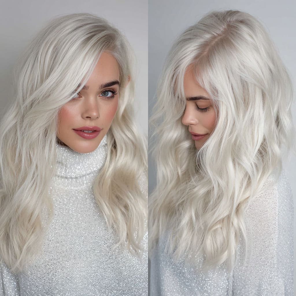 Nothing says winter wonderland quite like platinum blonde waves. The silvery tone sparkles against cozy sweaters and scarves, giving off major snow-queen vibes. Soft waves add dimension, making the color even more dazzling in the light.