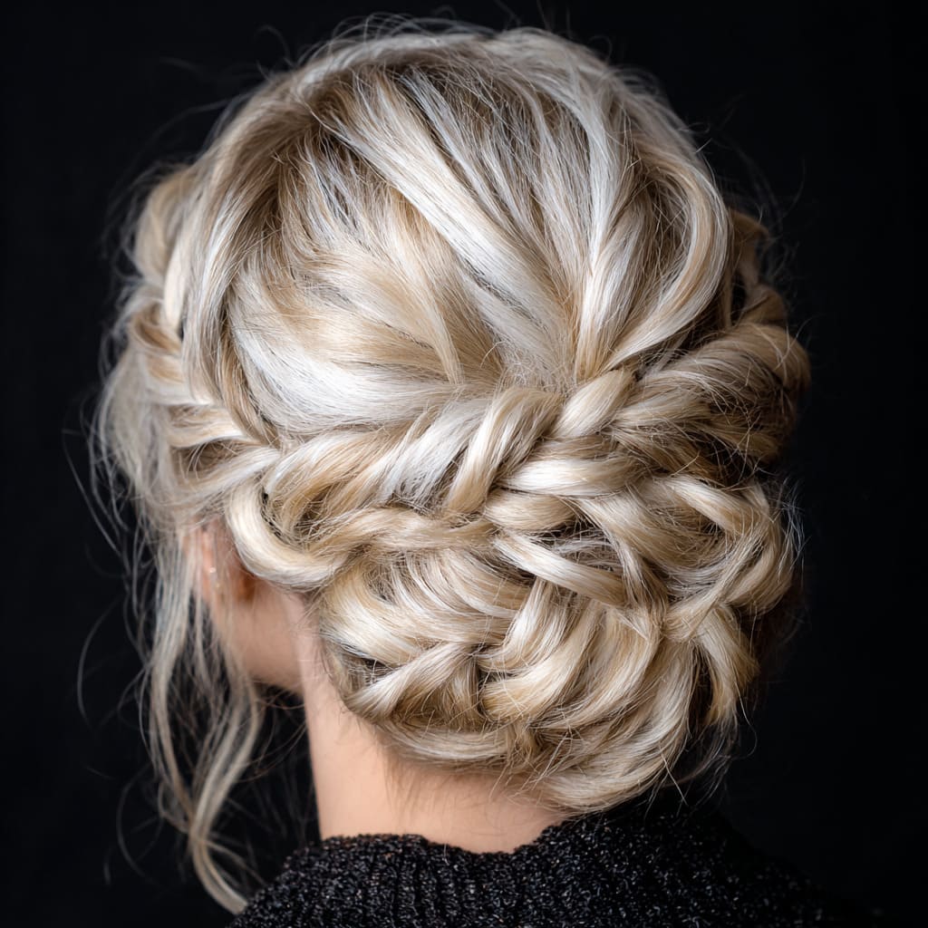 An elegant updo looks even more striking with frosted blonde highlights. Twists and braids catch the light, giving your hair texture and depth. It’s an ideal choice for winter weddings or holiday parties.