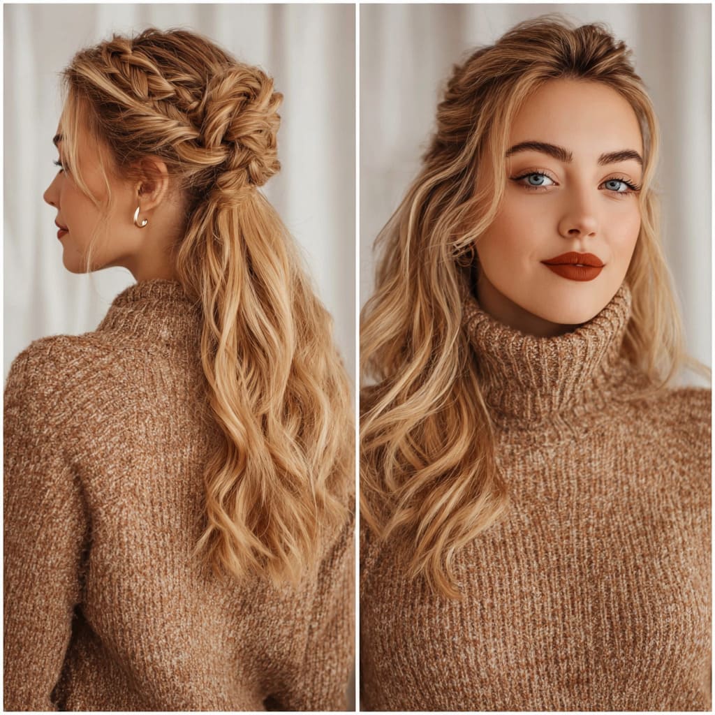 A half-up twisted style in honey blonde looks youthful and trendy. It keeps hair out of your face while still showing off length. This style works beautifully with cozy knits and bold winter lips.