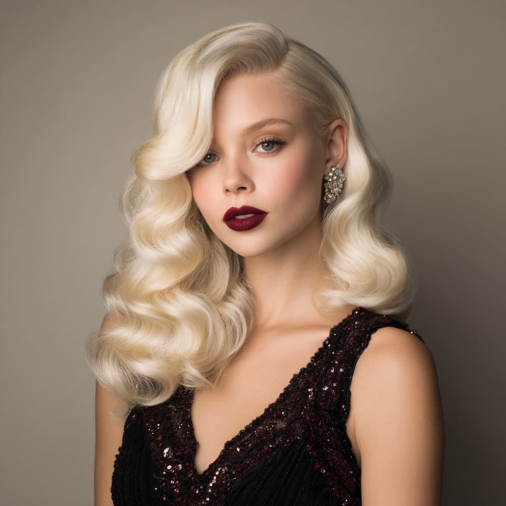 Channel old-Hollywood glam with deep platinum blonde waves. This polished, glamorous hairstyle is made for holiday parties. It’s elegant, feminine, and guaranteed to turn heads.
