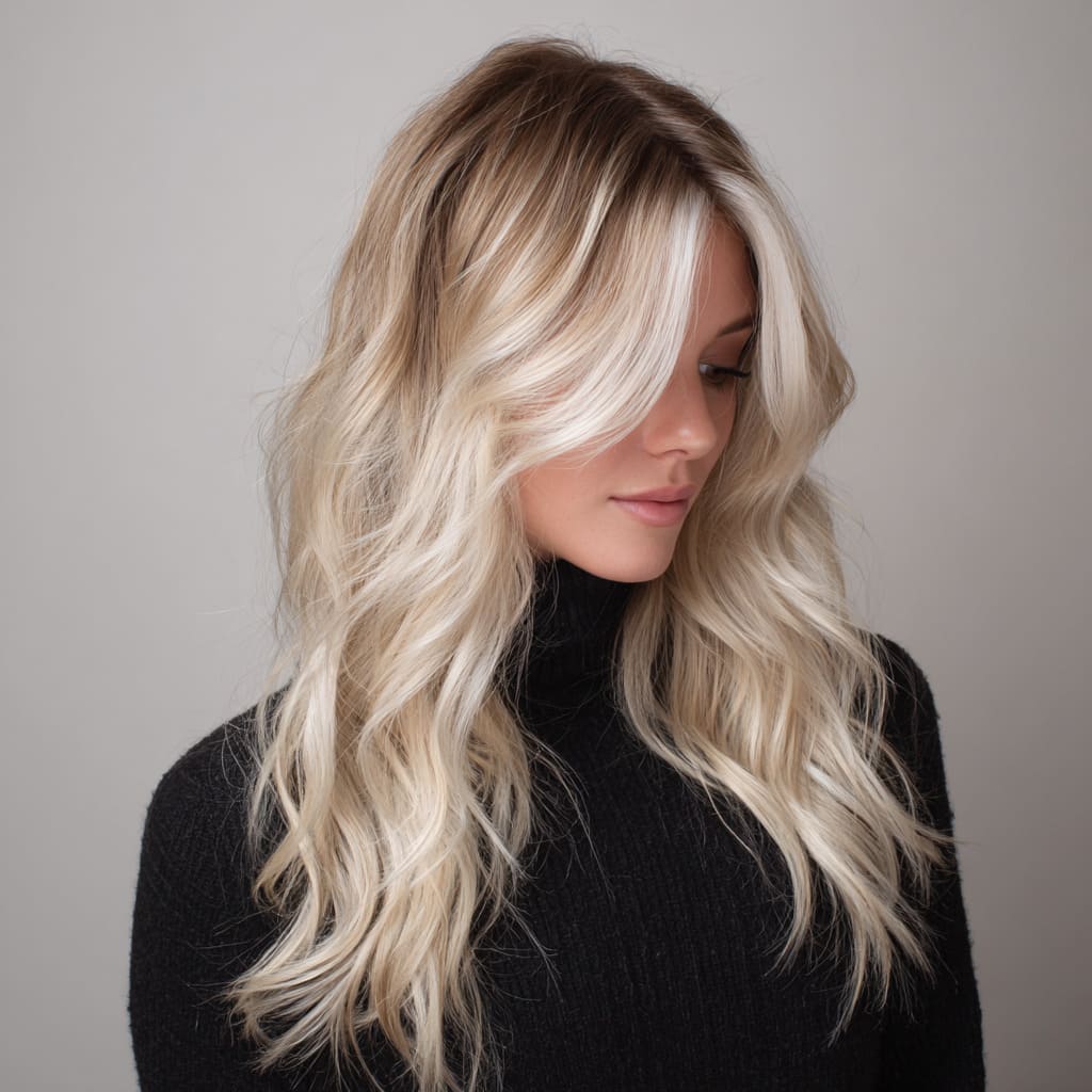 A darker root blended into icy blonde lengths is both trendy and practical. It gives your style depth while making regrowth less noticeable. Perfect for winter when you don’t want frequent salon visits.