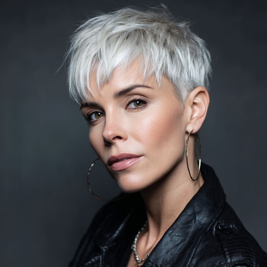 Go bold this season with a cropped silver blonde pixie cut. The edgy style shows off cheekbones while the icy tone feels perfectly seasonal. It’s modern, fierce, and easy to style.