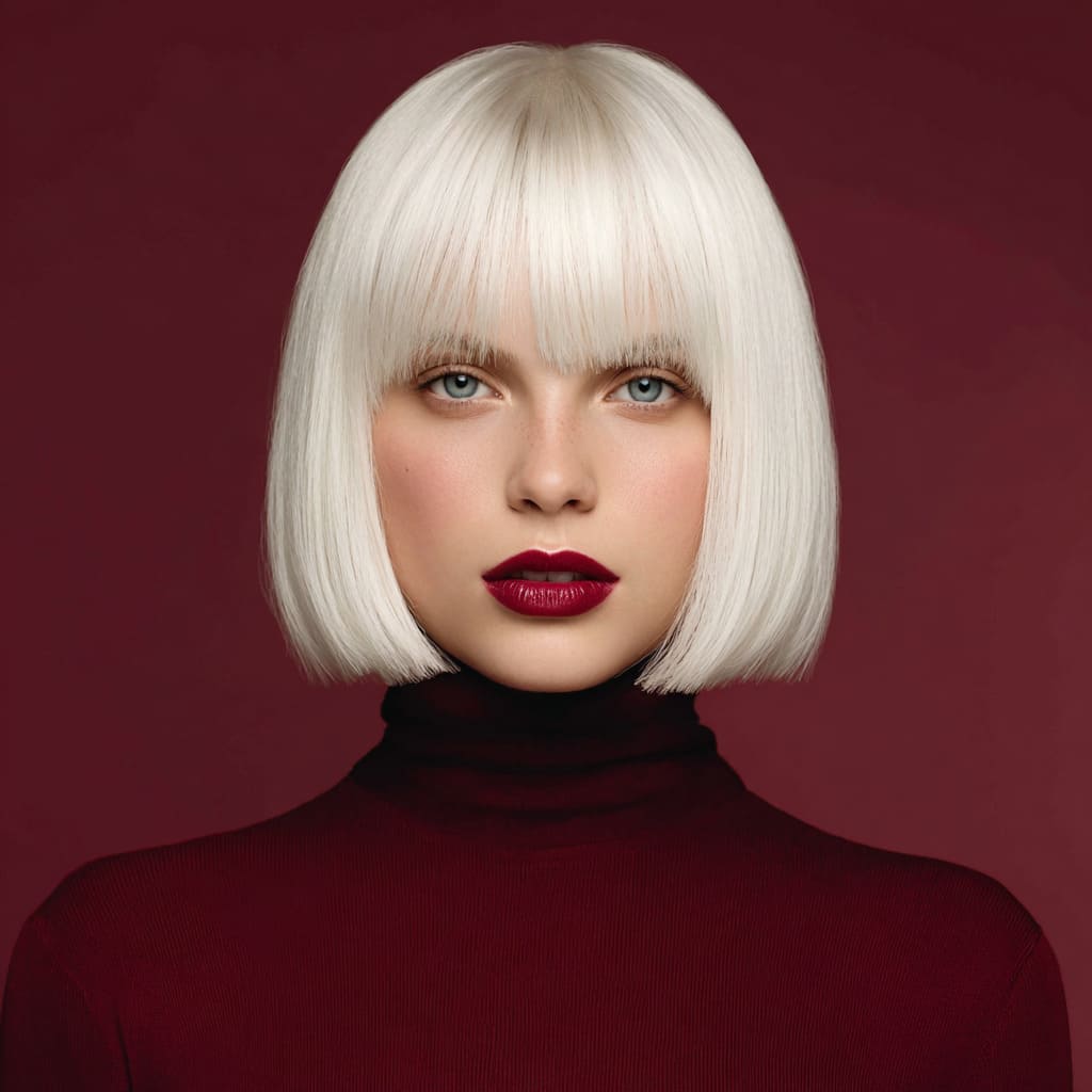 A blunt bob in snowy platinum blonde is bold and modern. The icy tone feels crisp and clean, like freshly fallen snow. It’s simple but makes a big statement.