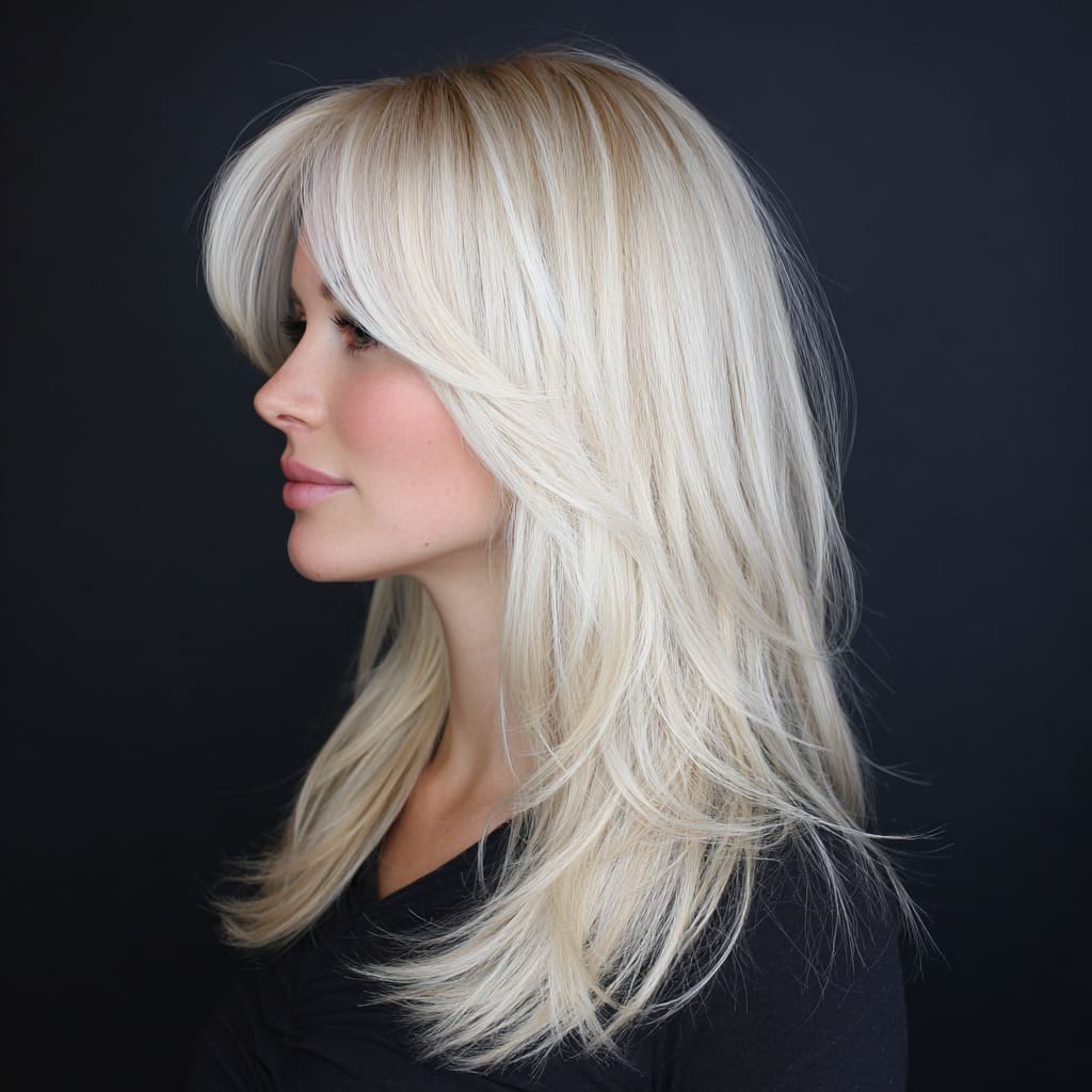 Vanilla blonde is creamy, bright, and oh-so-sweet. Layered cuts give it movement and dimension, making your hair look thicker. It’s soft, feminine, and perfect for cozy winter aesthetics.